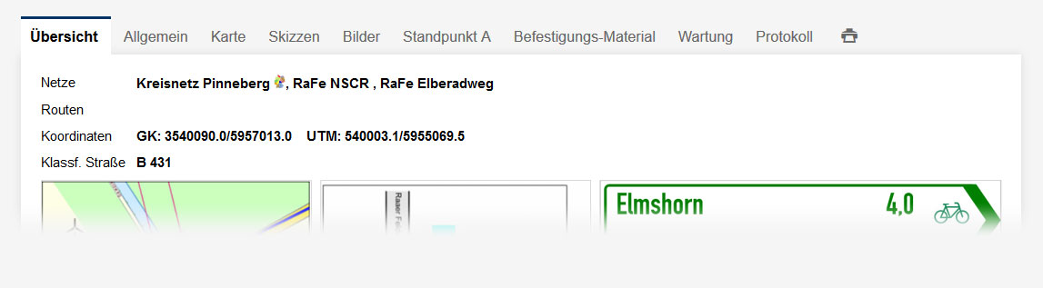 Die Schilderinhalte sind ein wesentlicher Bestandteil des Schilderkatasters. Es werden die Ziele und Entfernungen der Zielwegweiser dokumentiert, zudem können Piktogramme vergeben werden. Sollten einzelnen Radfernwege oder thematische Routen den Standort kreuzen, werden diese ebenfalls berücksichtigt. Bei Zwischenwegweisern werden entsprechend die Richtungen angegeben. Ebenso wichtig ist das benötigte Befestigungsmaterial, welches detailliert erfasst werden kann.